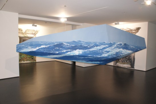 For Sailor, 2011, Cvijanovic abandons the wall altogether by stretching painted Tyvek sheets around a geometric form. He has painted the suspended object with a realistic rendering of a bright blue ocean and sky scene. Here Cvijanovic pulls the experience into three-dimensional space as well as beyond the gallery walls. Cvijanovic’s painting installations give viewers a universal experience of interacting with space(s) on varying planes, and ultimately continue to question where its boundaries begin and end.