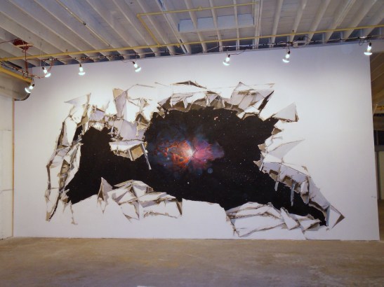 In many of his earlier installations, Cvijanovic extended the paint to the very edges of the Tyvek surfaces in order to evoke an immersive space. Stardust is based on images of the Orion nebula, which exists just south of Orion’s Belt in the constellation of Orion in space. Cvijanovic provides viewers with a glimpse of something they can only see through a telescope or in photographs, yet makes the space seem real enough to walk right into. In Stardust the painted illusion of a blowout in the wall’s surface draws our attention beyond the boundaries of the gallery walls.