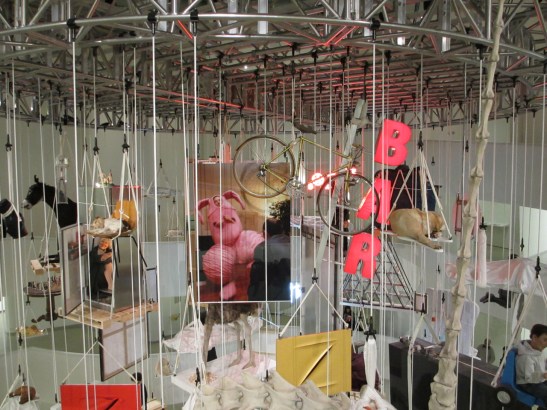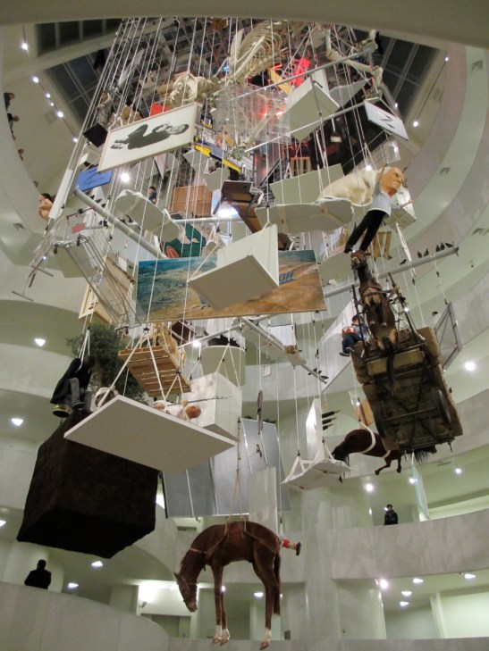 Little was offered for conceptual clarification excluding a smartphone app and audio headset. The installation was also stripped of chronology and hierarchy, yet this turned out to be okay. Spectators were left to their own thoughts and relied mostly on clues from the artist’s use of parody and cultural critique. Upon entering the Guggenheim and looking up from the bottom, the installation appeared both mysterious and gloomy as the lifeless saddled horse in Novecento (1997) set the plot in motion. Walking up and down the spiraled corridor gradually revealed the details until reaching the top. From above, everything appeared dopey and motionless as if shocked to death by a surge of former creative energy. The climax of the show was just as unclear as the translation of Michel’s dying last words in Jean-Luc Godard’s Breathless: “C’est vraiment dégueulasse,” which could mean anything from ‘It’s so disgusting’, ‘Makes me want to puke’, or ‘Life’s a bitch’. On the other hand, this feeling of uncertainty was rousing because it kept the credits rolling in a loop.