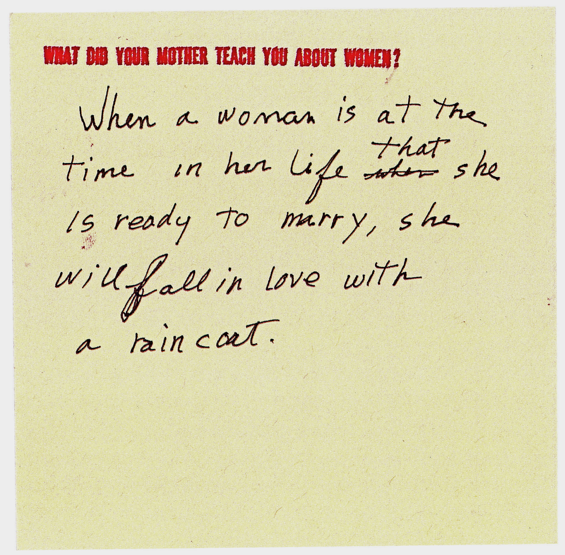 MaryBeth Edelson, Story Gathering Card, Raincoat, from Malmo, Sweden, 2002. Image courtesy of the artist.