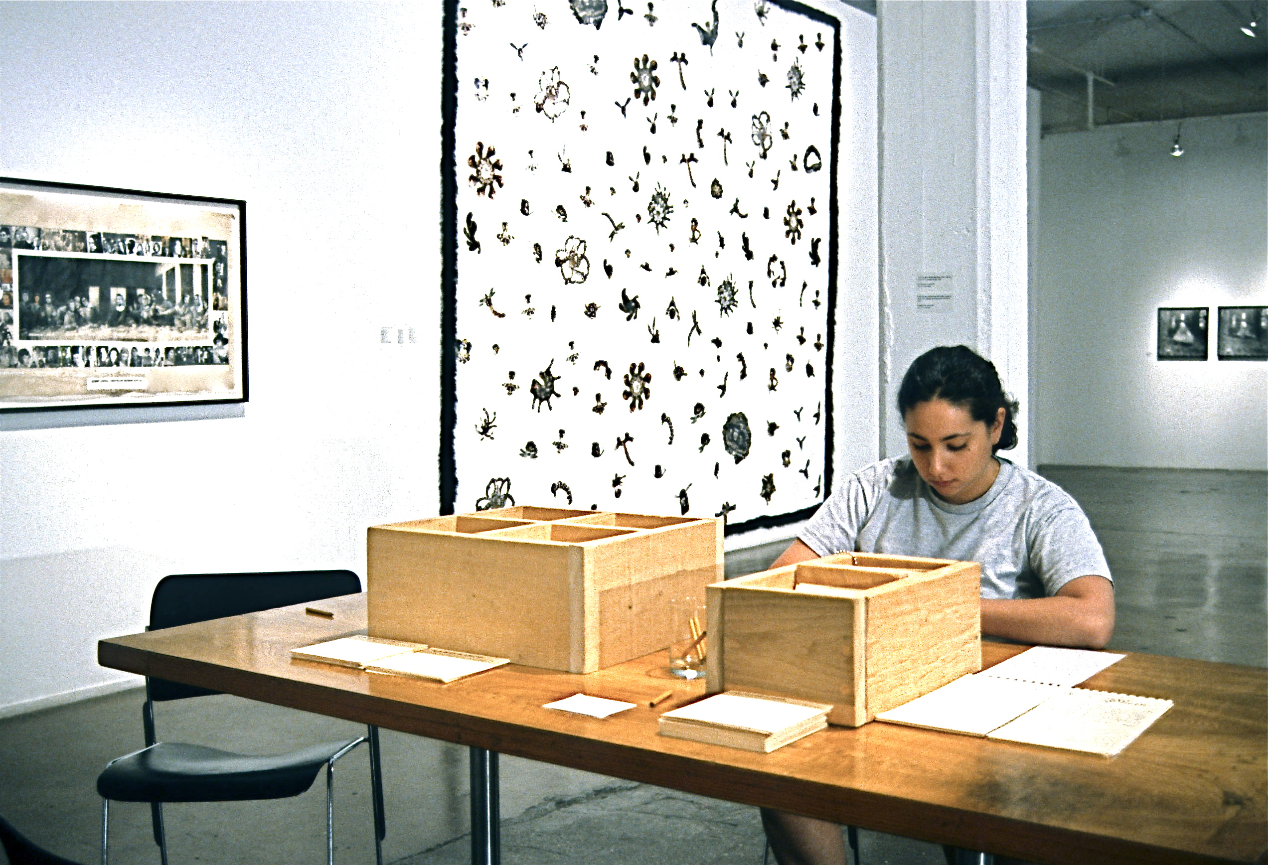 The boxes are made from thick pine board; simple, homemade, and built to last. They are divided into four sections, each one holding a couple hundred or so plain paper tablets. Rubber stamped at the top of each tablet is a question – one to each section – that broaches a central theme. For example, the Gender Parity Box, exhibited four times since 1985, asks the questions: What did your mother tell you about men? What did your mother tell you about woman? What did your father tell you about women? What did your father tell you about men? There is a pen with a long string attached to the box and a card nearby, inviting you to look though the stories already gathered and to feel free to add your own. The boxes usually sit on a sturdy table large enough to accommodate a chair or two.