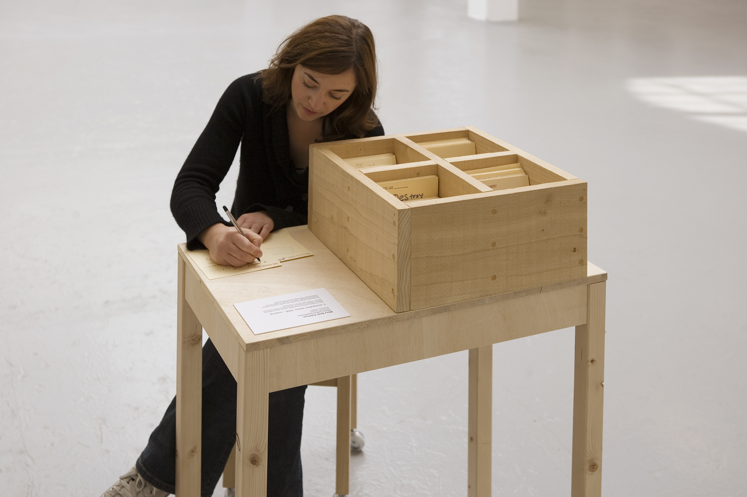 MaryBeth Edelson, It’s Time for Action, participant writing in story boxes, Migros Museum, Zurich, 2006. Image courtesy of the artist.