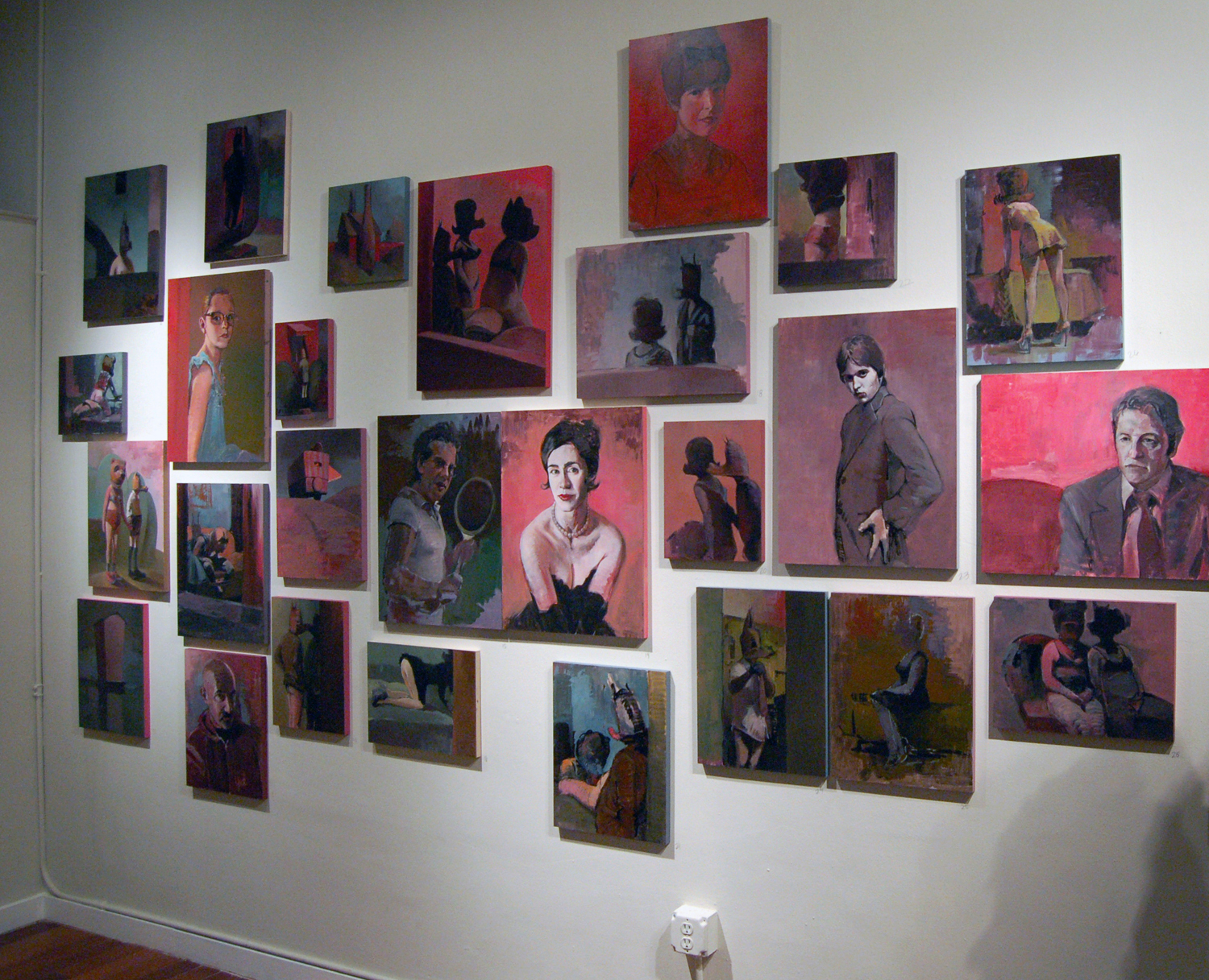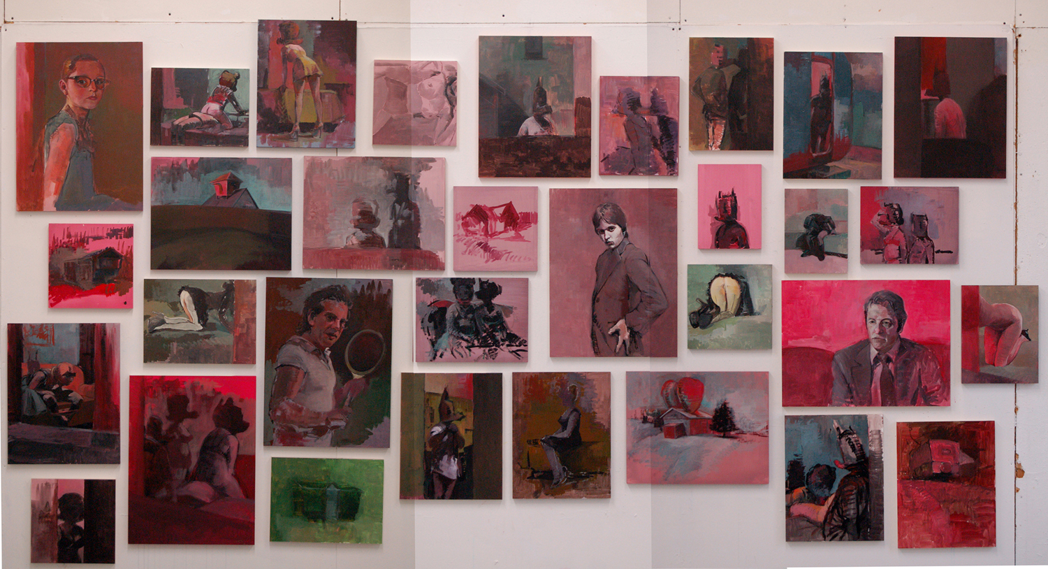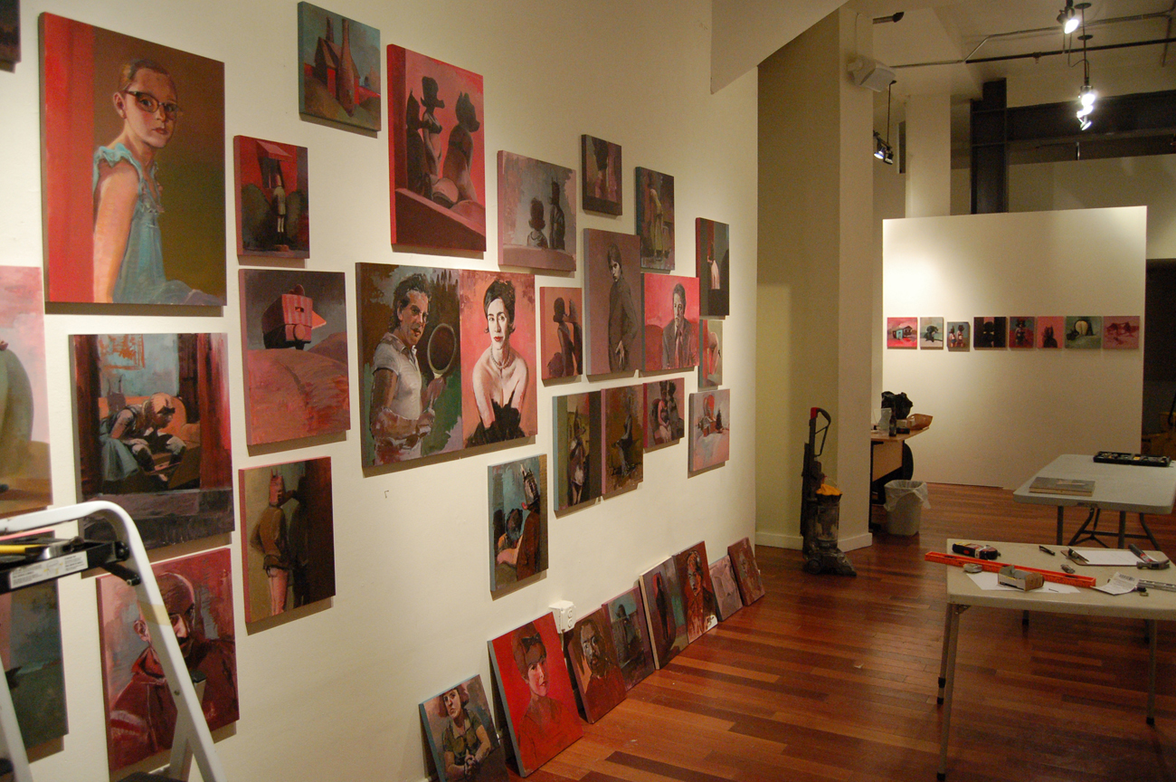 Initially, I kept the genres separate over the course of the four-week period in Vermont. A series of portraits, of individuals who were now absent from my life at home, were hung salon-style on one wall. On the opposite wall a counter body of work developed from ideas generated and recorded on the journey to Vermont from Savannah, Georgia was arranged. These included structures in landscapes and invented figures and narratives of individuals engaged in questionable or bad behavior. While this was in some ways an extension of previous works that dealt with institutional forces that affected individual behavior; these particular narratives were directly related to personal behaviors that are within an individuals’ control. They include acts of voyeurism and narcissistic conduct that investigate issues of trust and underlying intentions.