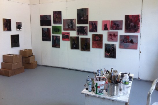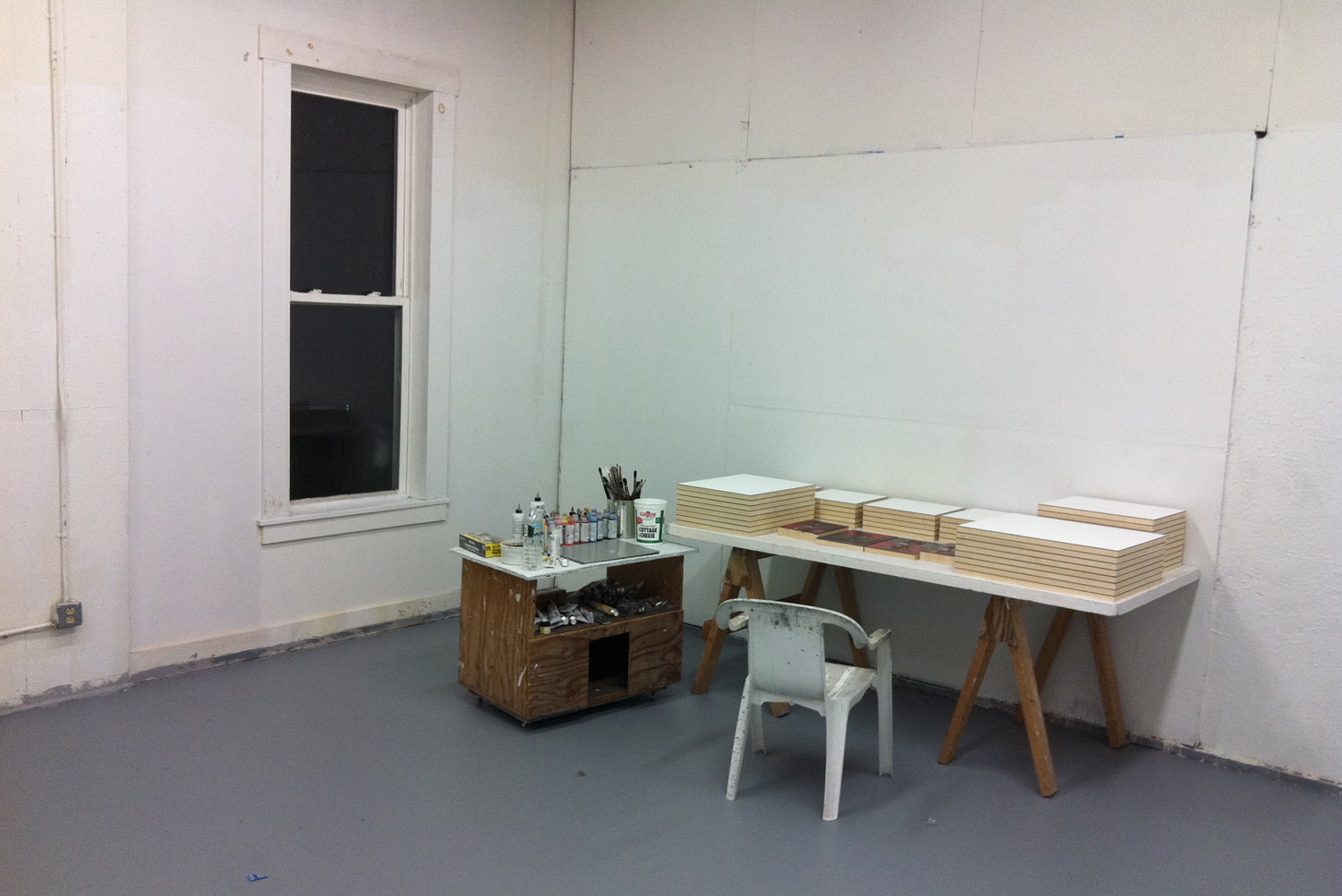 I participated in four exhibitions, two solo and two duo, during a twelve month period from June 2011 to June 2012, making a new body of work for each show. The work from the third series of paintings was initiated in Johnson Vermont during a four-week residency in November and December 2011 and was created for an Exhibition to be held at Satellite 66 in San Francisco in March 2012. The goal was to keep the entire project self-contained, driving to the locations for production and for exhibition without the use of a specialized vehicle. The materials for production in Vermont were transported in an unassuming Ford Escape, and the works for the exhibition in San Francisco were driven from Savanna, GA in a rented Toyota Camry, 45 panels comfortably packed in the trunk.