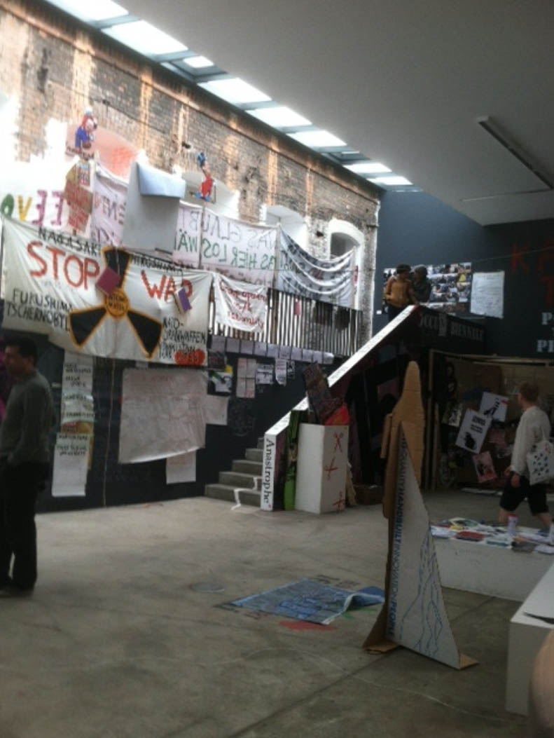 The ground floor of the KW Institute, formally called “Global Square,” did resemble an art installation, mixing the authenticity of the protest camp that was a base of operations for many public demonstrations that happened out on the streets around the city. There was a radio station (99 percent), a newspaper, live streaming and blogging, and a packed calendar of events and workshops on topics like budgeting, financial markets, civil disobedience, sustainability, urbanism, and climate change. Graffiti, slogans, and a conglomeration of art and protest signs decorated the walls around the encampment and continued up the stairwells leading to the exhibition spaces above. Competing messages were everywhere – stop corporate greed, stop war, practice sustainability, exercise freedom. The activists felt they were “unrepresentable”: