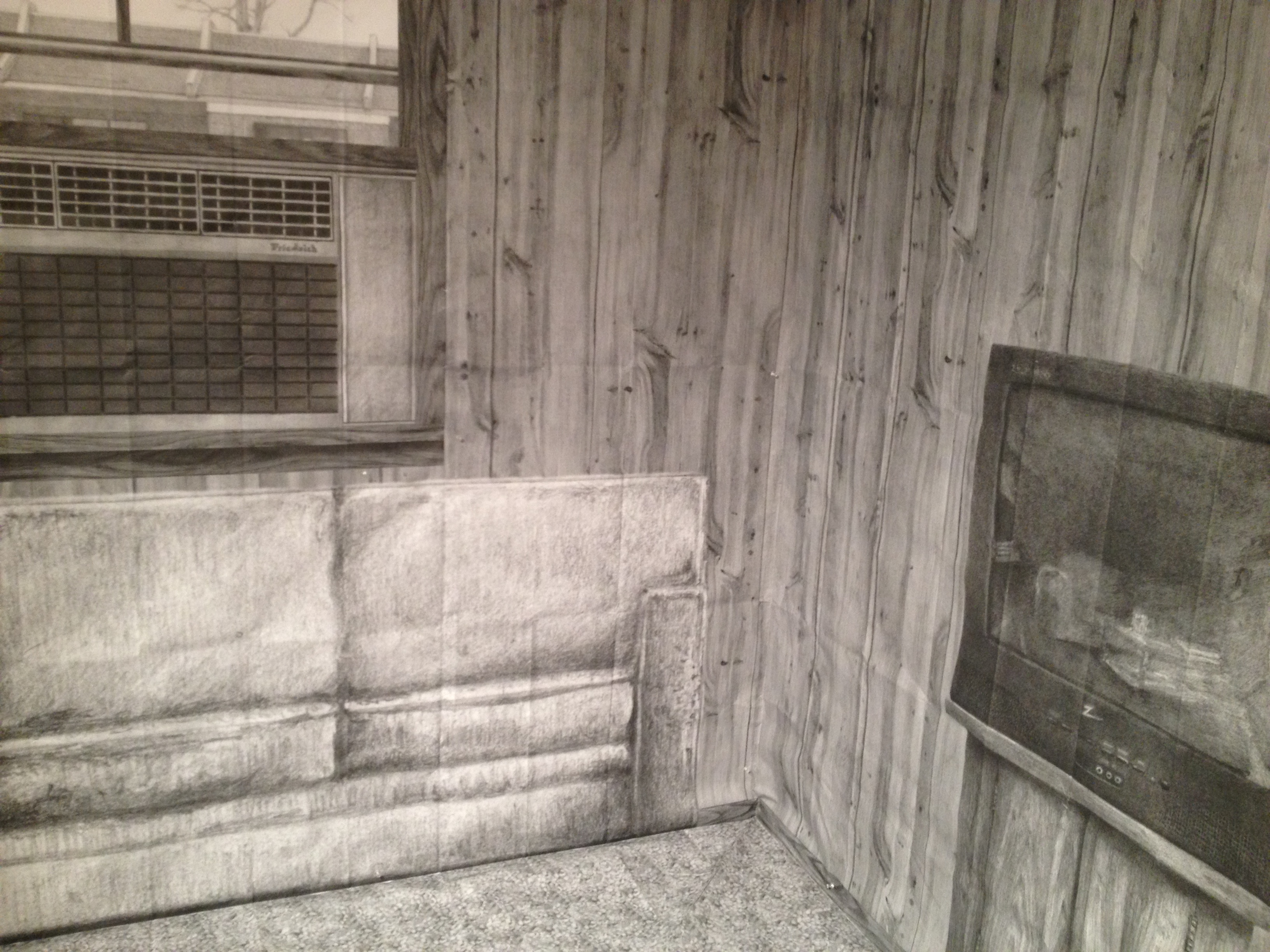 Gary Kachadourian, Life-Size Poster of One Quarter of a Room, 2013, large format xeroxes and transparent tape, 8’x8’x6′. Installation view. Image courtesy of Erin Dziedzic