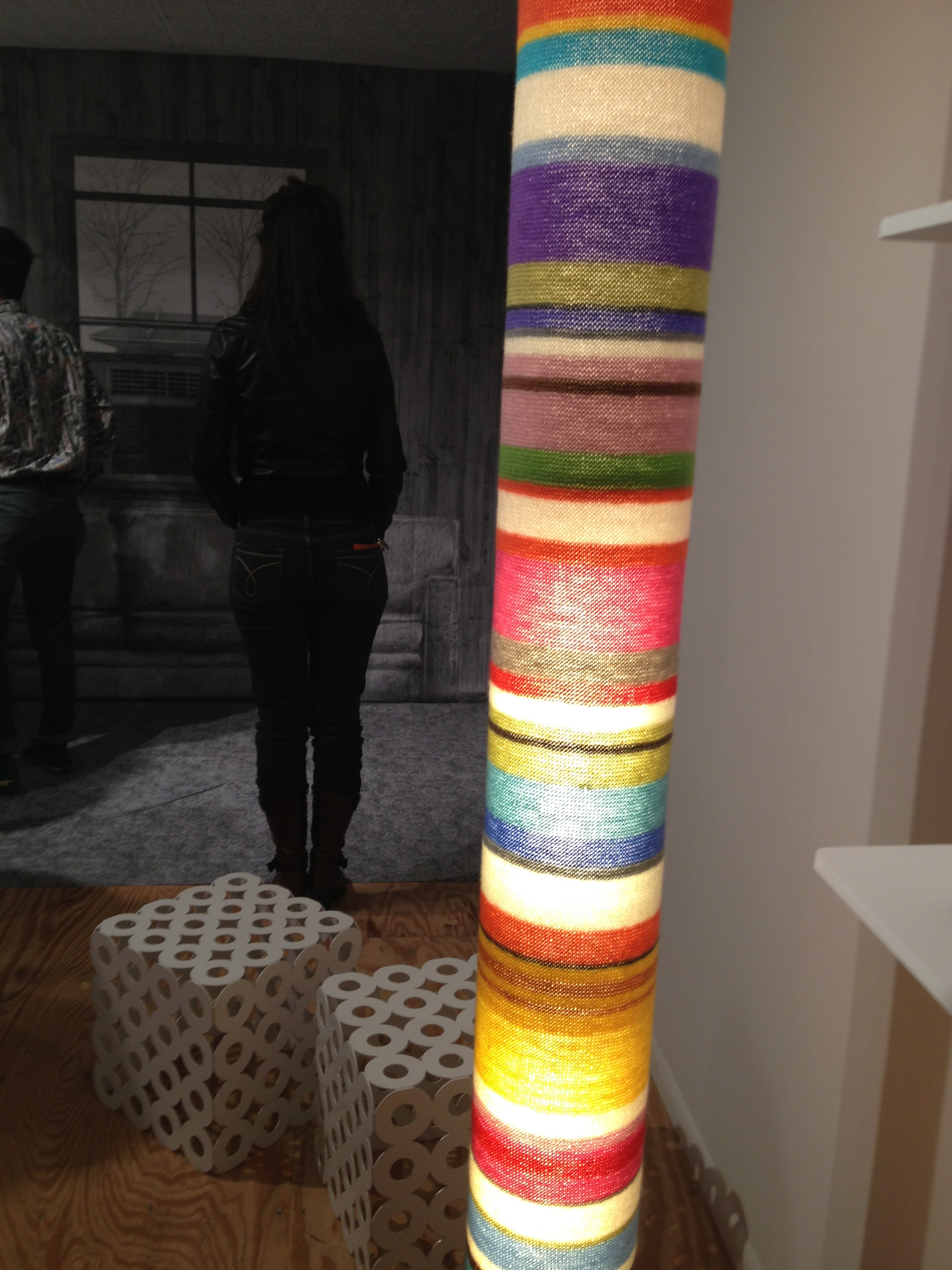 Egawa-Zbryk, Sweater Lamp, 2003, yarn, steel, plastic, flourescent light. Egawa-Zbyrk, Cube, 2003, powder coated steel, 15″x15″x15″. Installation view. Image courtesy of Erin Dziedzic